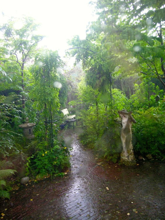 Zo juist valt hier een verfrissende hoosbui en kan de tuinslang opgerold blijven. De regen is meer dan welkom nu varens met name dreigden te verdorsten.