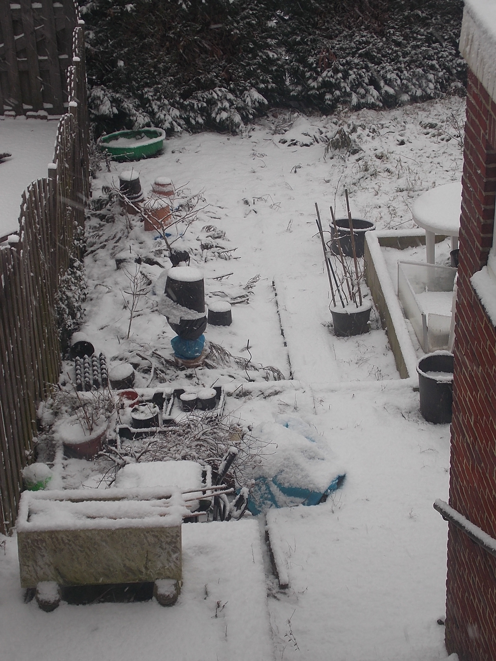 Vreselijke rotsneeuw! mijn trachy's zijn helemaal bezweken in de voortuin het blad doorgeknakt en het meeste door het gewicht helemaal naar beneden getrokken, om 11.00 uur stopt het en ga ik met de tuinslang alles afspuiten, hier vind alleen de hond het prachtig nu inmiddels 8 cm! behhhhh....