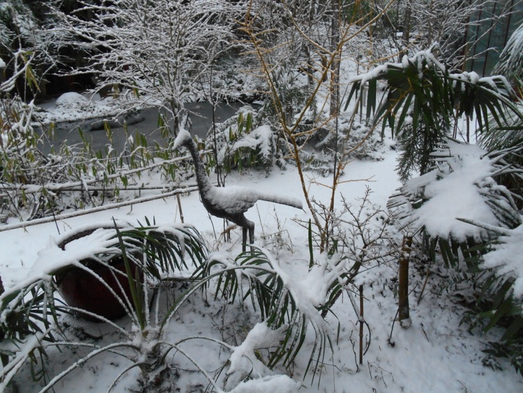 Door de plaksneeuw in Flevoland hangt de bamboe en Trachycarpus bijna tot op de grond.