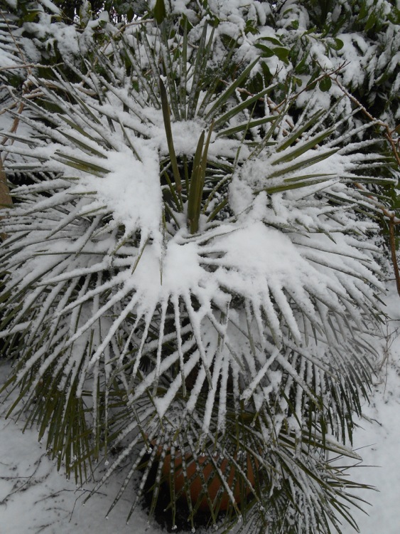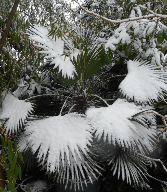 De Trachycarpus van de achterburen die er al vele jaren staat krijgt al een wit laagje: