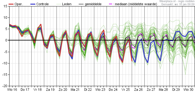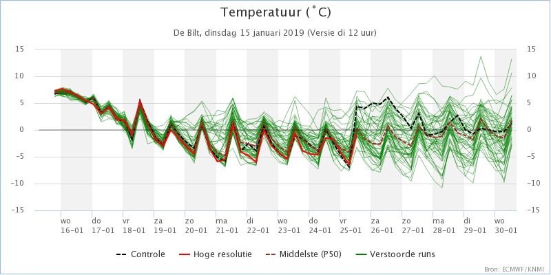 Bovenstaande inschatting haal ik uit de weermodellen van de laatste dagen, maar is ook in lijn met de meest recente 4 weken verwachting die voor laatste decade januari en 1e februari een negatieve temperatuurafwijking van 3 C boven ons gebied aangeeft.