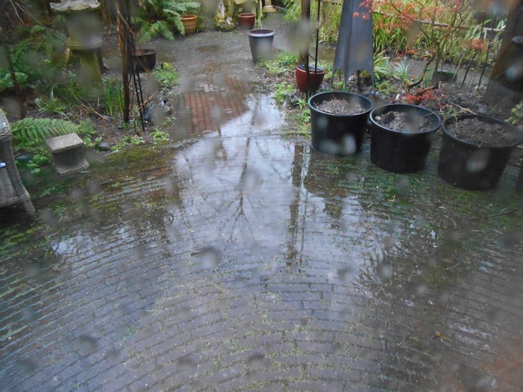 Hoeveel neerslag hier inmiddels is gevallen heb ik niet bijgehouden, gisteren was het weer goed raak. De regenmeter met ± 60 mm was al eerder overgelopen. Onze 'buren' Staatbosbeheer zijn er blij mee nu het waterpeil weer terug is op het 'normale' winterse niveau. Voor sommige fietspaden heb je nu meer aan een waterfiets.