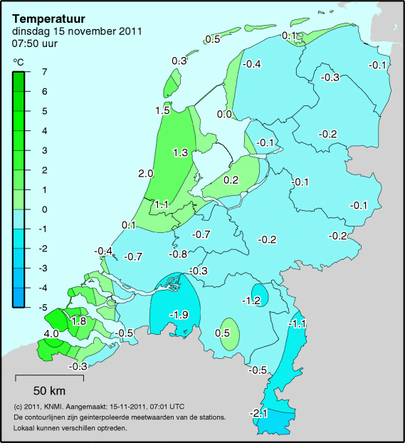 Hier is vanmorgen de eerste echte nachtvorst een feit (T. min -1,3 en T. act -0,8). Stelt nog niet echt veel voor en gelukkig is alles lekker droog. Na woensdag gaan de nachttemperaturen weer stijgen.