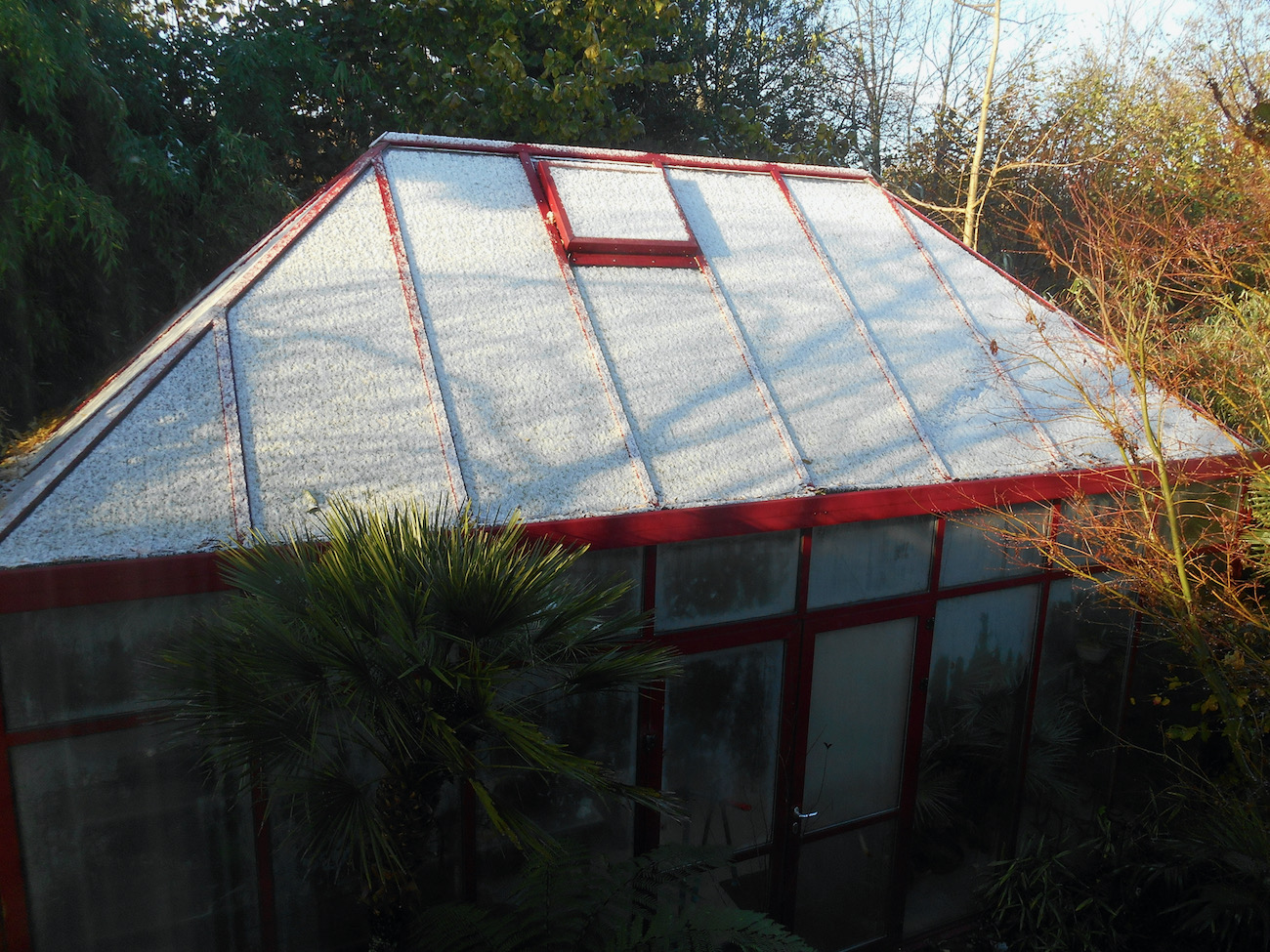 Sneeuwval vannacht bezorgde de kas een witte laag. Op de grond was het vanmorgen alweer verdwenen.