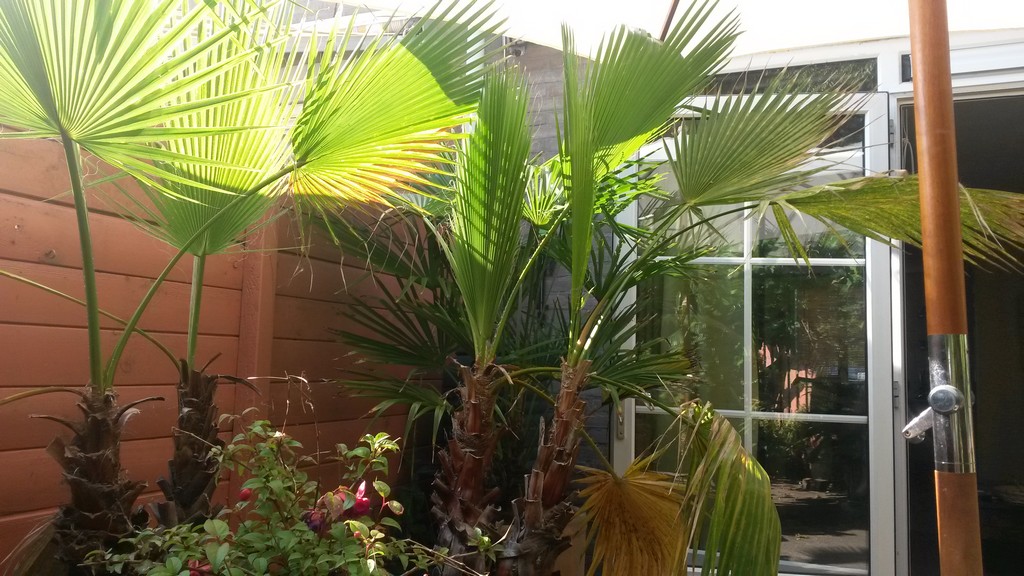 Toen eenmaal de zaden van de Washingtonia afkomstig van Tenerife ontkiemden, ontkiemde bij mij de voorliefde voor een tropische tuin. Sommige planten in de tuin zijn helemaal niet tropisch, maar helpen wel mee de illusie te wekken. Er zijn bv planten die qua blad lijken op een alocasia. Een paar bloeiers als Clematus en fuchsia kleden ook mooi af. Varens kunnen de suggestie van palmen (of cycas) wekken. Een inmiddels enorme druivenplant en blauwe regen kleden de tuin helemaal af. Zeker in het voorjaar is de illusie compleet.