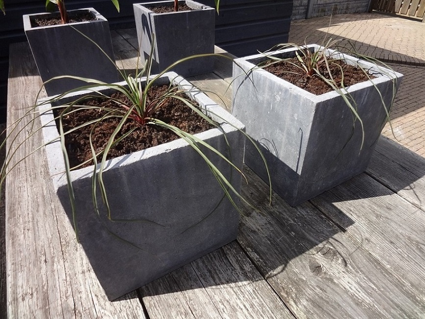 het is geen antwoord op uw vraag maar wel een goed bedoelde opmerking nl, ... zorg dat het water onderaan weg kan uit uw mooie plantbakken.
