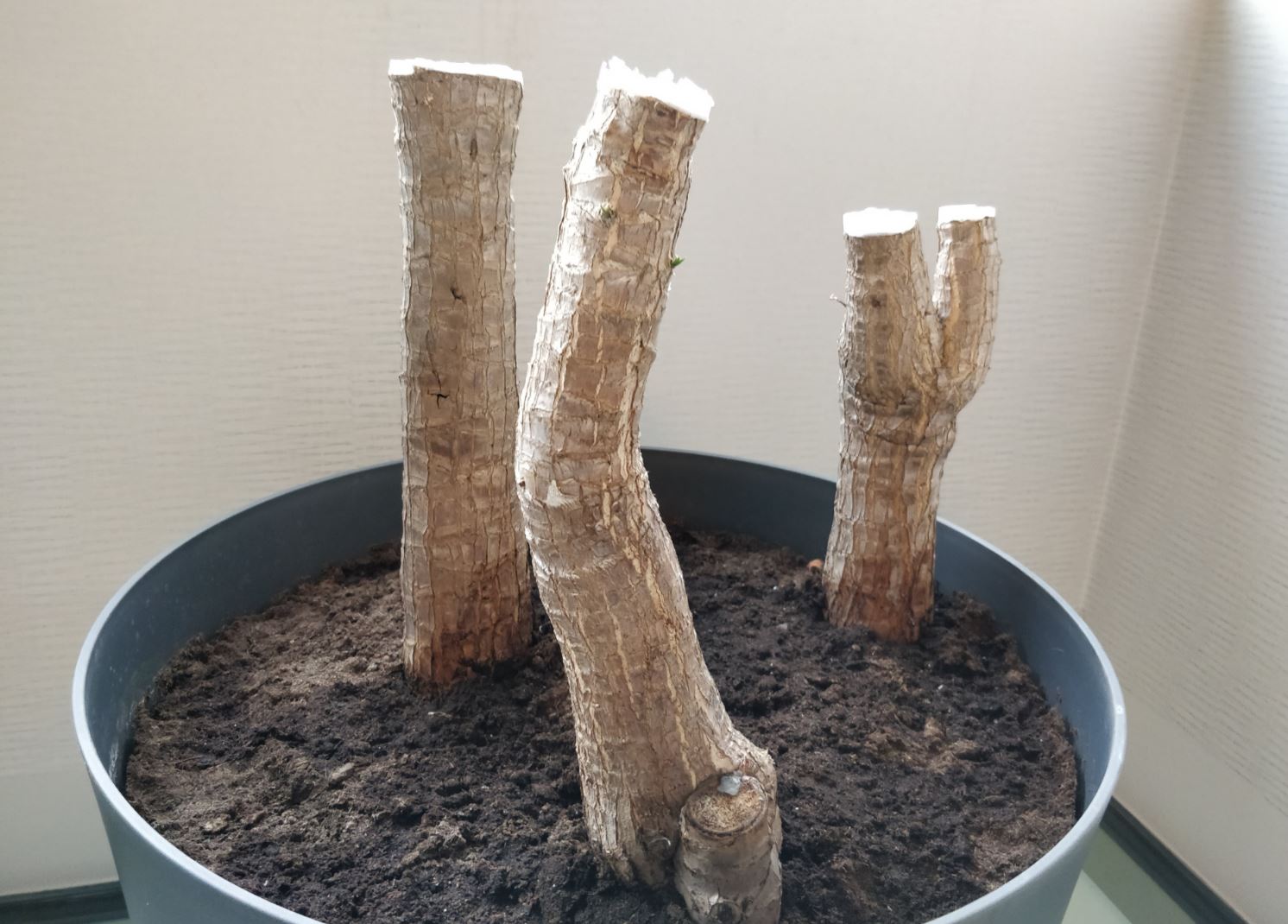 Oplossing 2: de stam onderaan afzagen net onder het punt waar er zijdelings nieuwe stengels zijn aangegroeid?