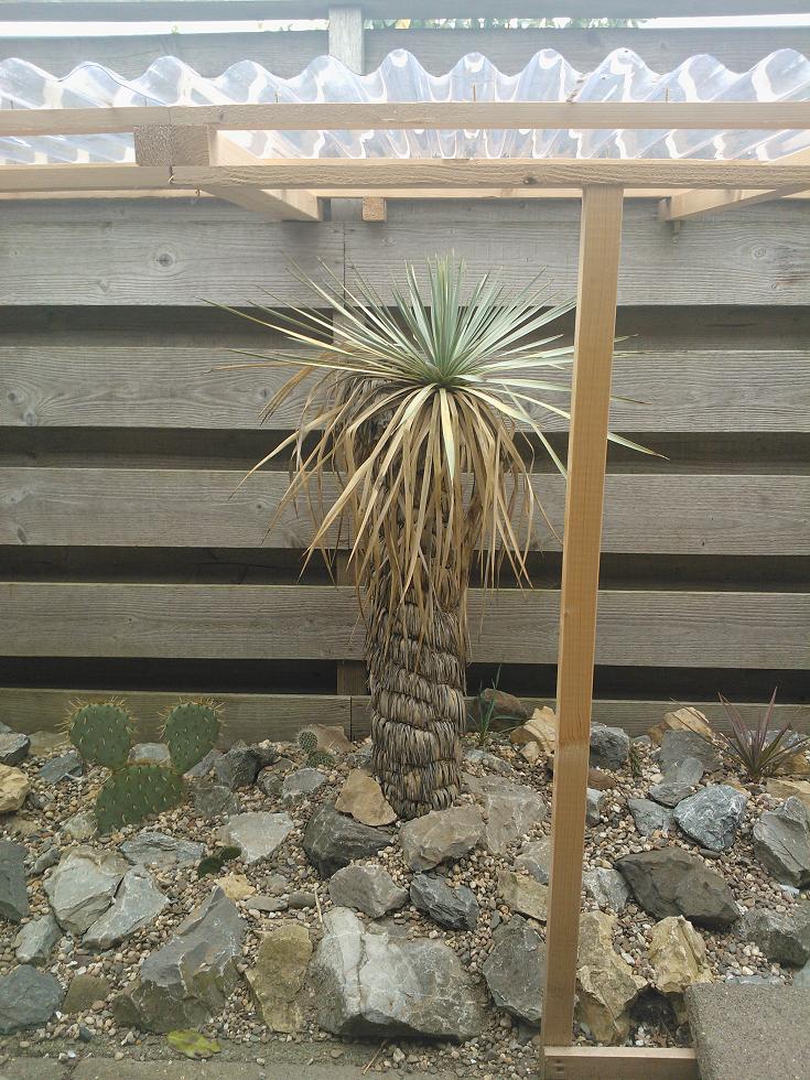 heb eens gezegd; "de ene heeft een haag corniferen, ik wil een haag boomyucca's" . in die gedachtengang begint dit er al aardig op te lijken. kan uiteraard nog wel meer staan hutjemutje op elkaar maar vind het zoals het nu is al echt mooi lijken. kom hiermee dan nog 1 tekort en dan is de hele strook een beetje zo ingedeeld met ertussen kleinere en cactussen. verkoper vroeg me nog wat moet je er dan met zoveel?? nou ik vind ze gewoon heel mooi :lol: