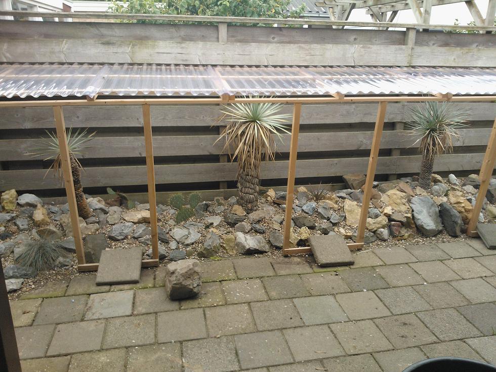 vandaag eens bezig geweest met het laatste deel van de afdaken boven de rotsstrook. tussen de reuzen uit Reuver is het mooi dicht, resteren de kluiten van deze grote rostrata's. nu wou ik perse iets demontabels en tevens de golf van de platen haaks op de rest ivm afwatering. vorig jaar waterde het af tegen de stam en dat is niet ideaal. als het klaar is, is het uiteraard simpel maar vooraf toch even zitten dubben hoe het nu doeltreffend en degelijk te krijgen. de eerste is klaar de tweede volgt na het weekeinde wel. simpel frampje van panlatten met golfplaat erop geschroefd dusdanig dat ik m zo eraf kan pakken en straks met de rest weg kan zetten voor volgend jaar ;)
