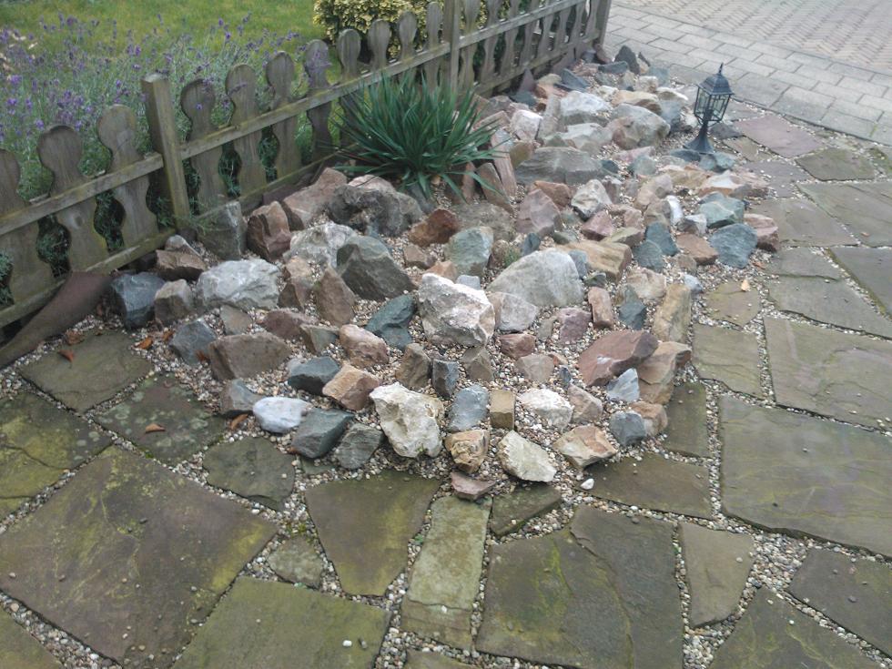 voortuin nooit veel aan gedaan behalve wat flagstones erin en een bak grind. recent daar ook wat stenen voor verzameld en eens een begin gemaakt in dezelfde trend. helaas kan ik hier geen prachtige yucca's kwijt omdat er te weinig zon komt, wel komen er wat meer standaard exemplaren die dit kunnen hebben en eventueel de hardere cactussen indien ik er teveel stekken van krijg of ik ze in de achtertuin vervang door exclusievere :D