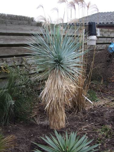 De Yucca rostrata (Nederlandse naam = Palmlelie) kan je in ons klimaat wel in de tuin plaatsen, hoewel je hem bij te strenge vorst (zoals deze winter) moet beschermen. Hun winterhardheid wordt doorgaans op -12 tot -15C° gehouden. Je begrijpt dat de vochtigheid tijdens die koude temperaturen ook van groot belang is.