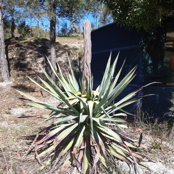 deze plant is bezig om een enorme bloeistengel te maken. Ik vermoed dat het een Fucraea foetida is, maar weet het niet zeker en sta open voor suggesties. Na de bloei zal hij vele broedplantjes aan de bloeistengel maken. Hij is dus makkelijk te vermeerderen. Helaas kan hij slechts lichte vorst hebben...