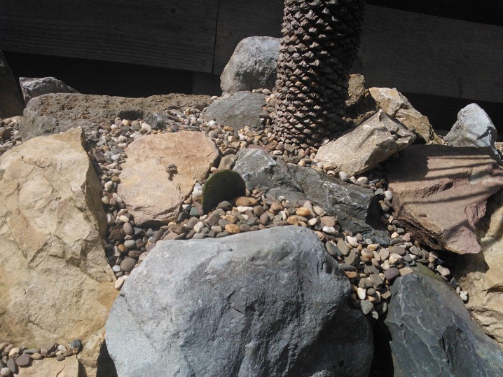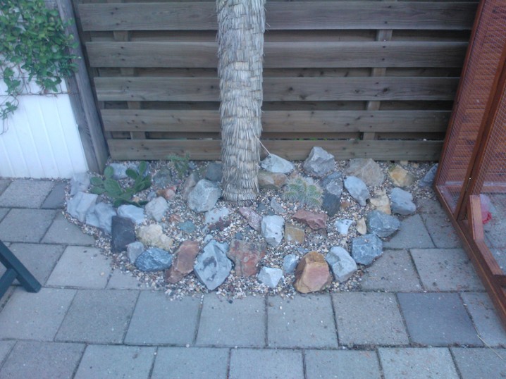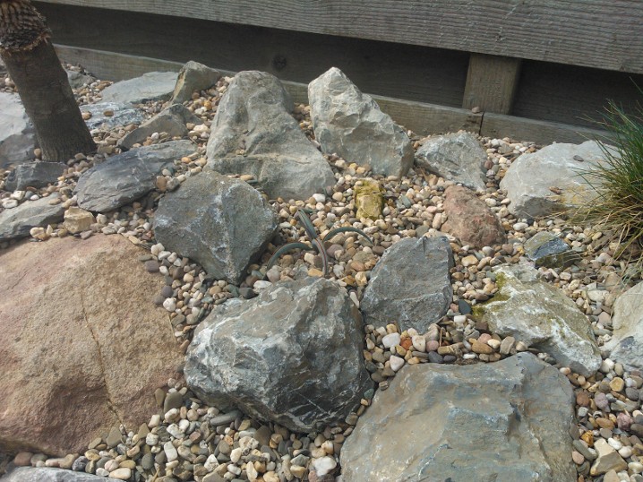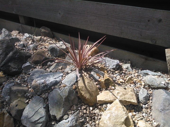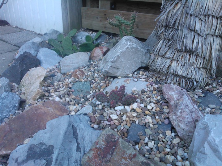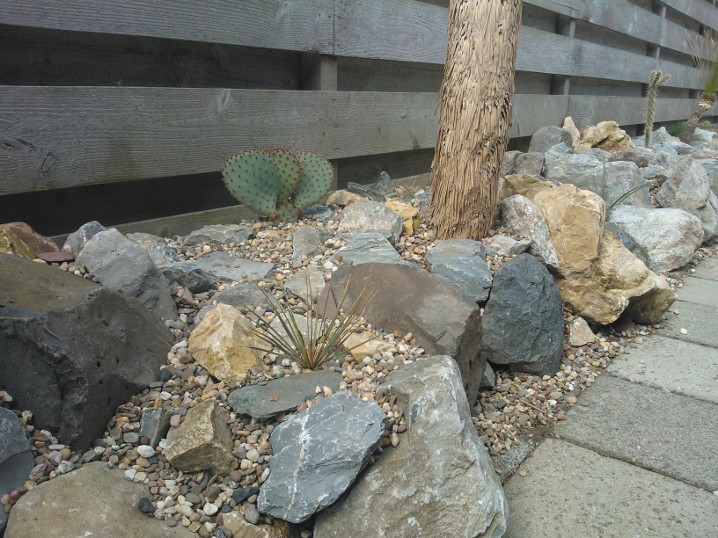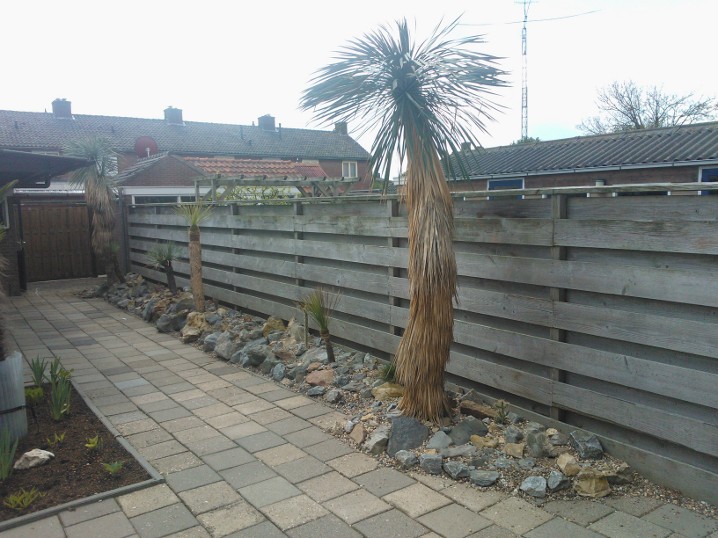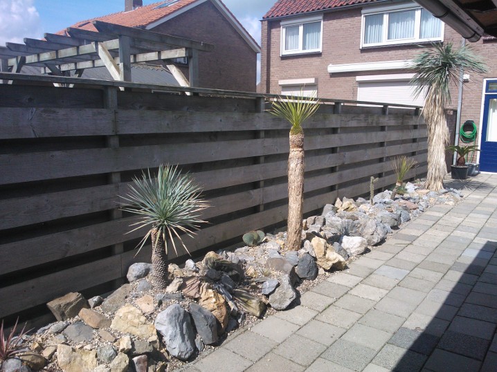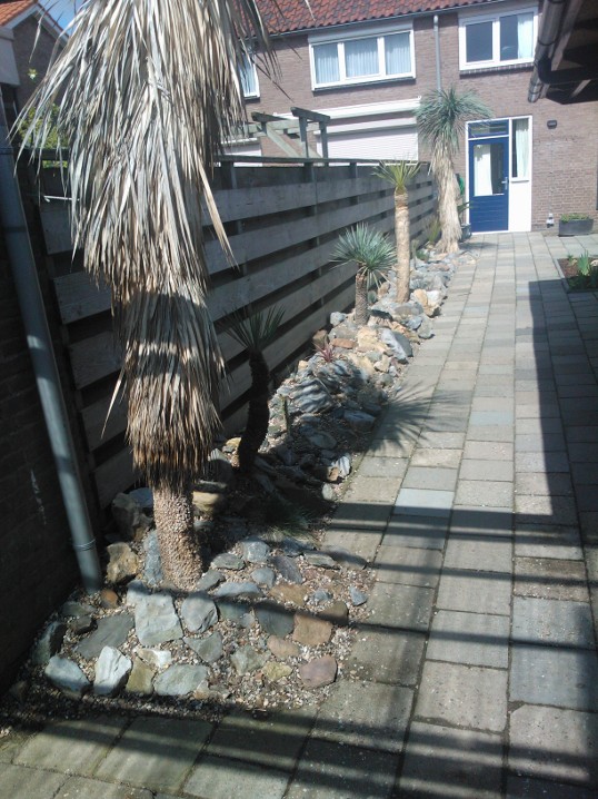De strook is ongeveer een meter of 10 lang waarvan de helft mijn drainage bak is van de hele tuin. Dit is ruim een meter diep uitgegraven met onderin gaten geboord tot in het zand. Deze "bak" voorzien van een tractorband in delen op de kop erin als luchtkamer en verder grind en rotsblokken toegevoegd. Hier watert mn schuurtje op af, die van de woningbouw, schuur buurman en overtollige water van de tegels stroomt erin. Bak draineert als een malle zodoende hierbovenop de cactussen en yucca's geplaatst. De strook bestaat alleen uit rotsblokken en de ruimtes ertussen opgevuld met 4/16 grind waardoor het een luchtig geheel is, de planten staan tevens op het zuiden waardoor zo tot 1500 volle bak zon hebben.