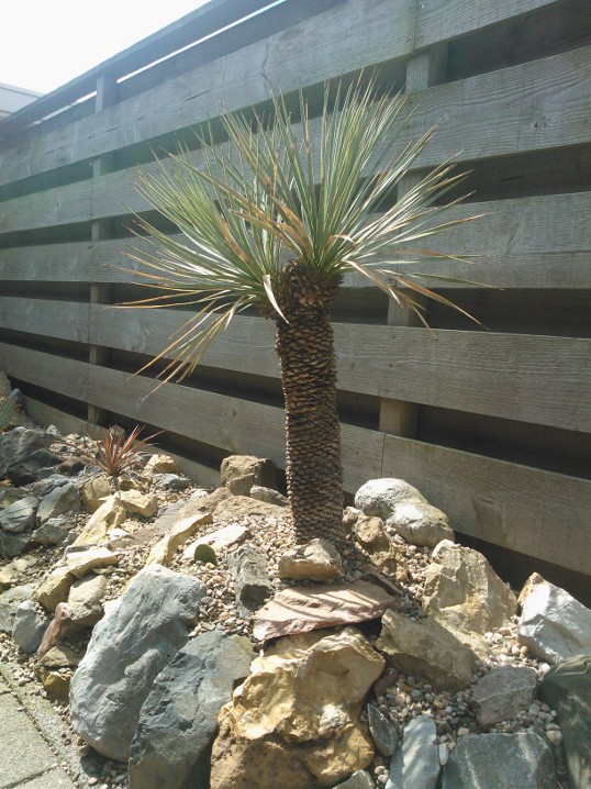 De grotere rostrata's aan het eind van de strook staan in de volle grond, de kleinere yucca's ertussen allemaal in zeer ruime potten. Dit met oog op eventueel verplaatsen, aanpassen strook icm de zeer tere wortels. De cactussen staan allemaal ook gewoon los in de "volle grond" aangezien die grotendeels op de plek staan en makkelijk wortelen.