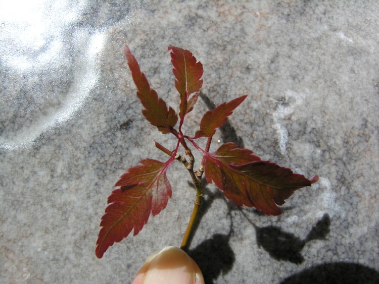 Ik vroeg of je de bladvorm kan beschrijven. De soortnaam palmatum van Acer palmatum heeft betrekking op de handvormige bladeren. Denk aan een kleine uitvoering van het blad van een plataan. Dat lijkt eenvoudig, maar er bestaan honderden varianten van deze esdoornsoort met betrekking tot groeiwijze, bladvorm en -kleur. Ik was laatst op zoek naar de naam van zo 'n gekweekte variant die in onze tuin staat, waarbij de handvorm maar met moeite is te herkennen, de Acer palmatum 'Beni hagaromo' (zie eerste afbeelding). Misschien kun je ook zo'n plaatje schieten van jou 'Giant' blad'?