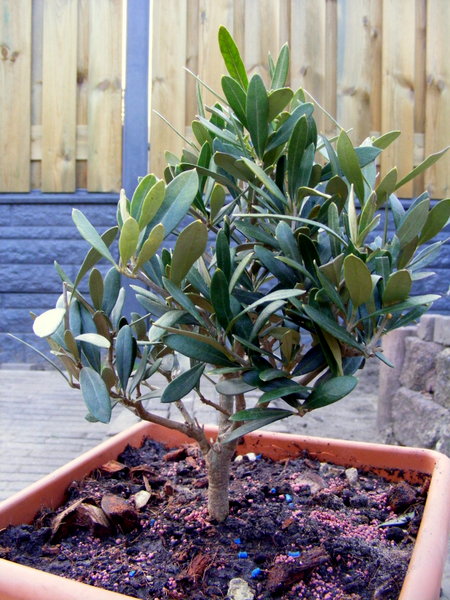 Ik heb zin's vorige week eindelijk een olijfboompje in de colectie afkomstig van Palma Verde voor maar 8 euro is het een leuk boompje om uit te proberen zonder grote financiƫle schade op te lopen. Vandaag is verpot en op het net gezocht waar ze beetje van hielden, zware grond en heb een combinatie van kleigrond, potgrond, zand, cocosvezel en koemestkorrels. Daar boven opgestrooid te palmen/olijfboommest (roze korrel) van Gardenpalms.