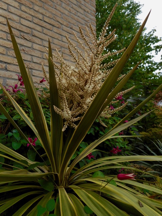 Nadat de groei van de Cordyline 'Torbay Dazzler' begon te haperen, kwam al snel de aap uit mouw. Er was een bloeiwijze op komst. De bloei verraadt zich door een doordringende zoete geur. In tegenstelling tot de meeste palmen bloeit Cordyline in de top net als Yucca 's en Agaves. De vegetatieve groei wordt daarbij opgeschort en de plant moet voor het groeiherstel eerst een nieuwe groeitop vormen. Een nieuwe groeiwijze ontspruit meestal onder de oude top maar er kunnen ook op de stam en aan de voet nieuwe scheuten uitlopen De bovenste uitlopers gaan meestal door en soms ontstaat hieruit een vertakking. Dit herstelproces vergt enige tijd en daarbij kan de plant veel blad en daarmee het aanzien verliezen.