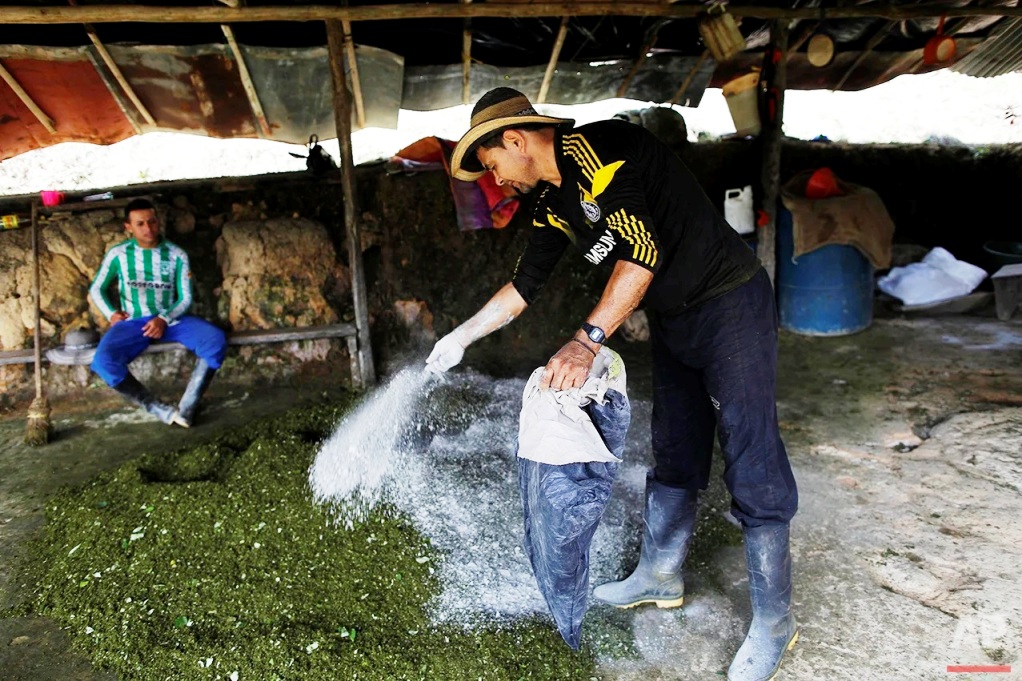 Vervolgens worden de versnipperde bladeren gemengd met soda om de cocaïne vrij te maken. Cement heb ik ook gelezen, als bindmiddel. Aan het mengsel wordt kerosine toegevoegd.