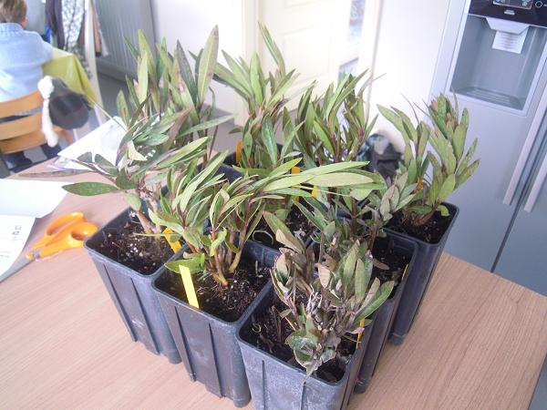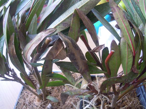 Sommige bladeren zijn uitgedroogd en zelfs rot. (het heeft niet met een gebrek aan water te maken, integendeel) Oleanders zijn sterke planten en ik verwacht een flinke groei en verbetering zodra de mooie dagen weer zijn aangebroken. Ze zijn wel goed doorworteld.