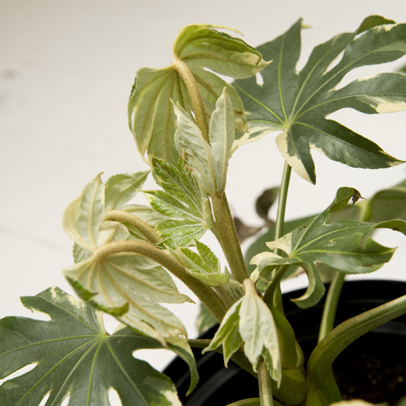 Ik ben echt gek op fatsia's, alle soorten en maten. Tot dit jaar alleen maar de groene variant in mijn bezit gehad, de fatsia japonica. Prachtige plant, alles vind ik er mooi aan, de bladeren, de glans, de groei, de houtige stammen, de bloeiwijze, de vorm en dat ze groenblijvend zijn is helemaal geweldig. Sinds een paar weken heb ik een bonte variant op de kop weten te tikken en volgende week krijg ik 10 stekken van de fatsia spiders web binnen.