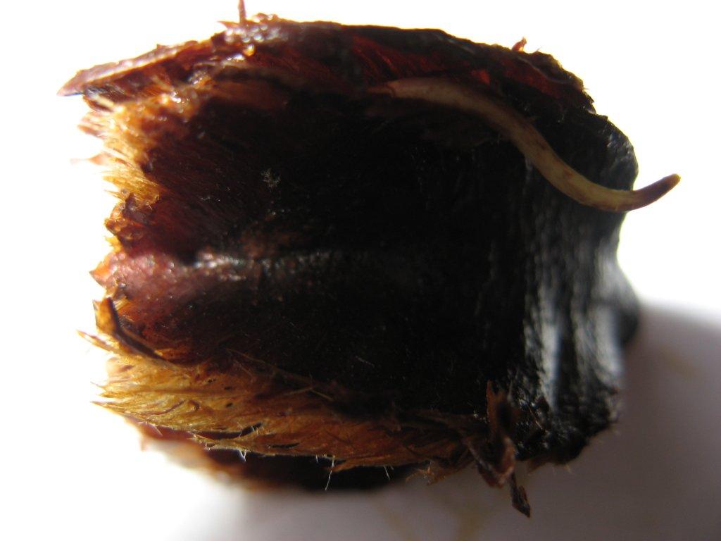 foto 2; gepeld; er zat een sponsachtig omhulsel omheen en in het midden een soort kokosnootje (de schil dan). Zag er echter uit als een soort knoflookteen maar na de ervaring van foto 1 ben ik maar niet verder gegaan. Ze liggen nu in mijn verwarmde kweekbakje. Houd jullie op de hoogte!