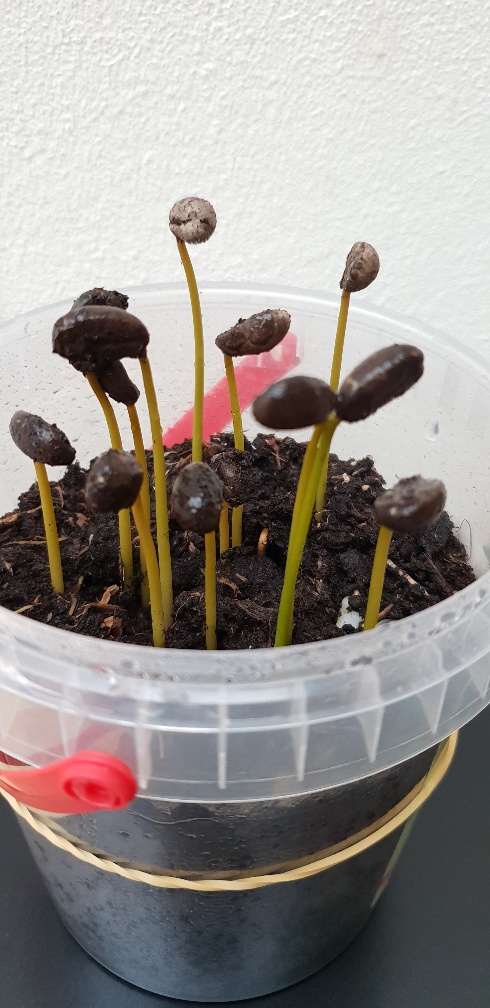Ook van mijn 2e batch gezaaide koffiebonen drukken de bonen inmiddels het zand omhoog na 22 dagen in de nabijheid van een radiator ook in een snoeptomaten emmer met aan de bovenkant luchtgaten.