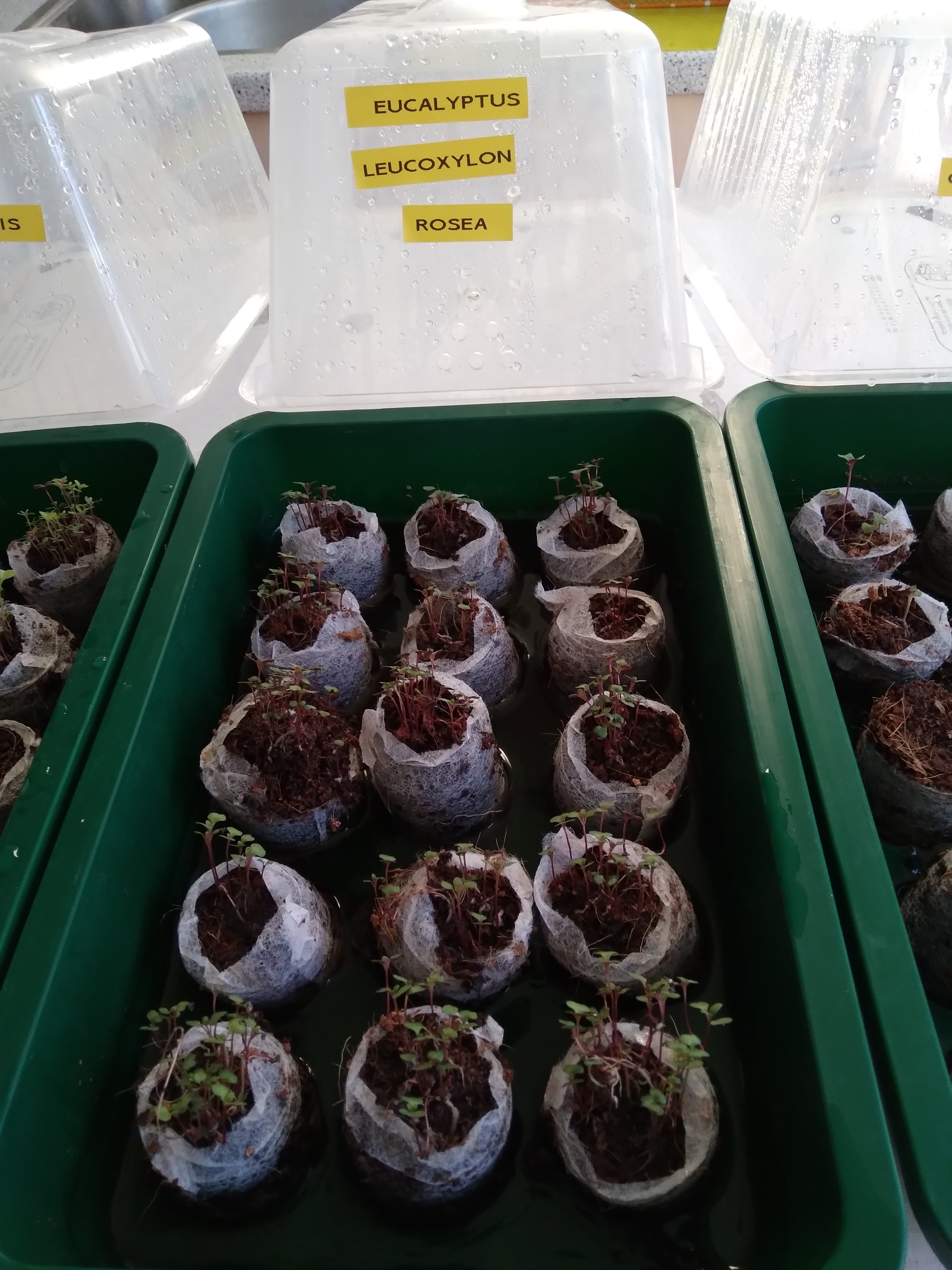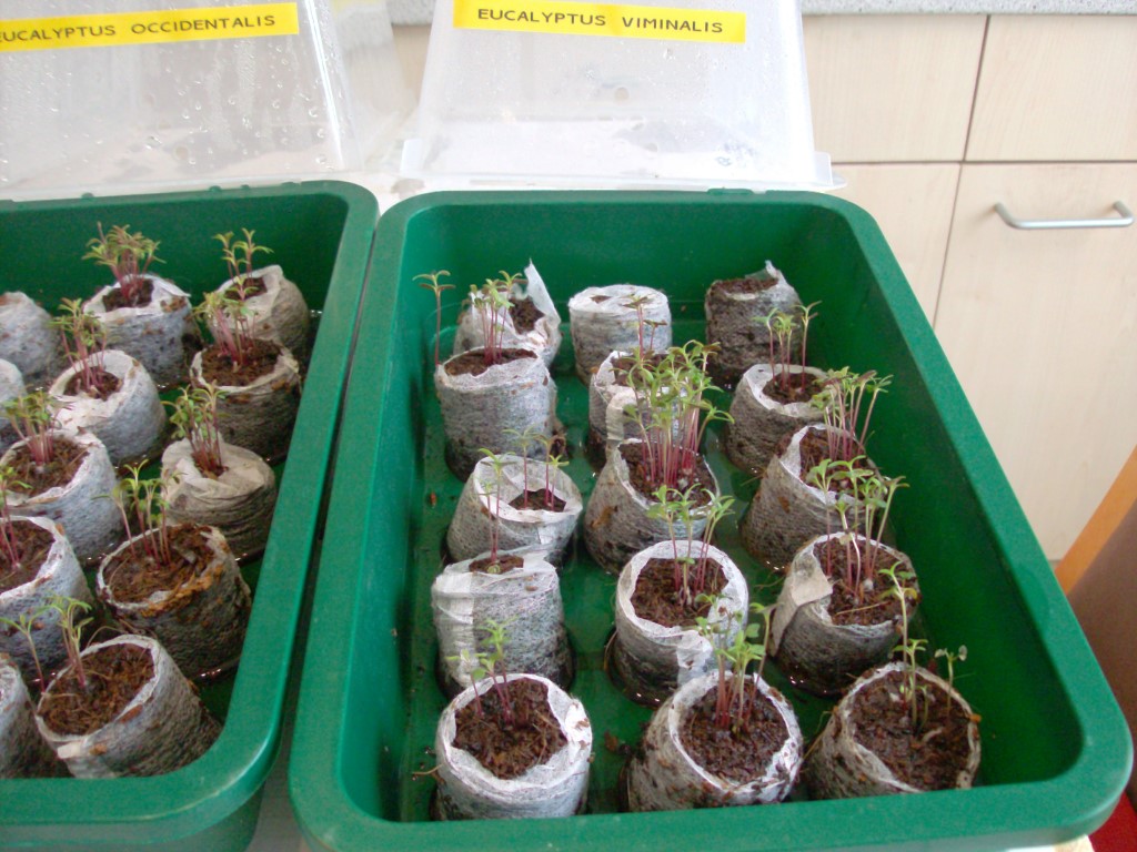 Zowel Eucalyptus grandis I als Eucalyptus grandis II in kweekkasjes binnenshuis.