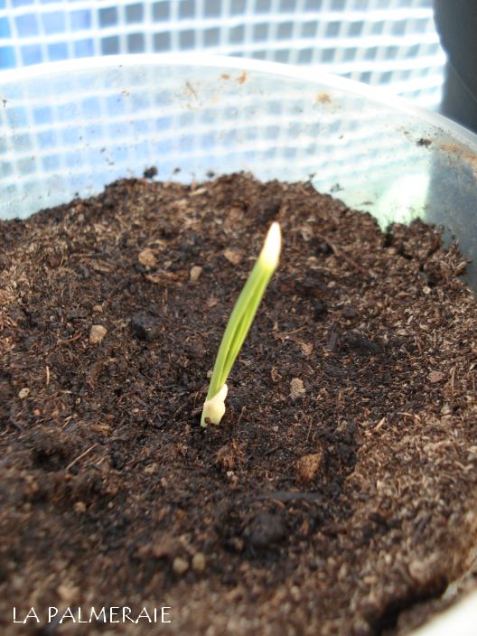 Het eerste blad groeit snel uit tot een lange spriet. De penwortel doet ondergronds hetzelfde in omgekeerde richting. Veel diepte voorzien is dus nodig. Een lege petfles of i.d. is prima geschikt.