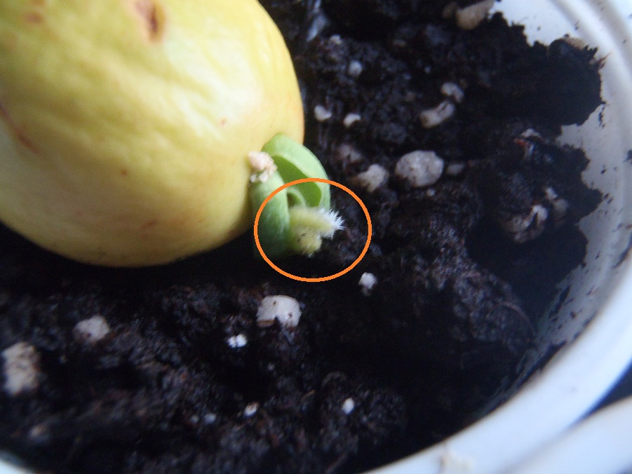 8 á 10 dagen na zaaien, komt het worteltje (wel contstant warm en vochtig houden), dan 15 dagen wachten dan komt er zoals het op de foto staat, het eerste blaadje.