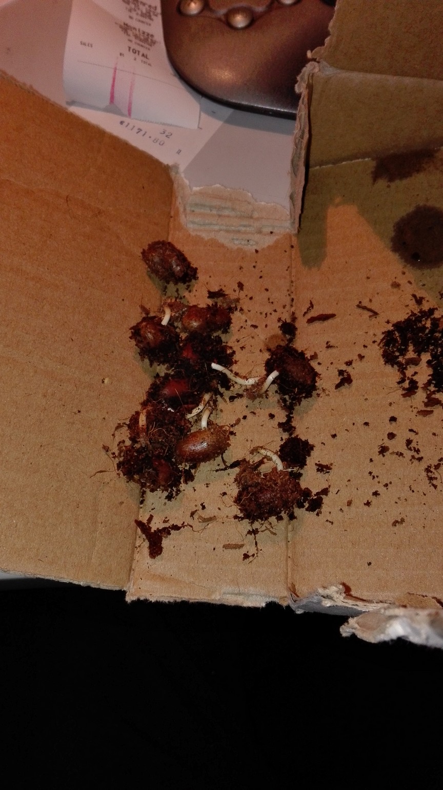 Bij nazicht van 1 van mijn bakjes waar eigenlijk te weinig cocosvezel in lag, zag ik er eentje uitsteken. Wel ik dacht laat ik dan maar het bakje eens omkieperen bleek dat er 13/15 zaden onkiemt waren.