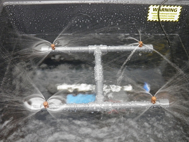 De sproei-installatie schakel ik in/uit via een tijdklok in het stopcontact. Voor brugmansia-stekken gebruik ik elk uur een kwartier aan en drie kwartier uit.