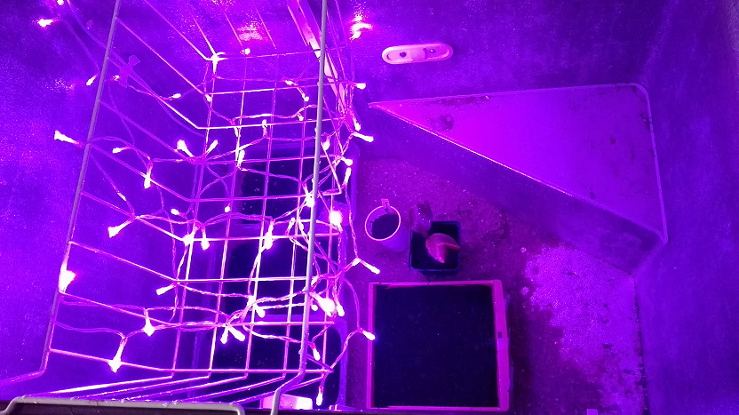 Wel ik heb dus mijn driepvrieskist omgebouwd tot kweekkast. Een kabel van 25Watt op de bodem vast gemaakt en daarop witte zand gestrooid die vochtig was. Ander kweekproject is voor zaden die bij kamertemperatuur kunnen kiemen (foto 3).