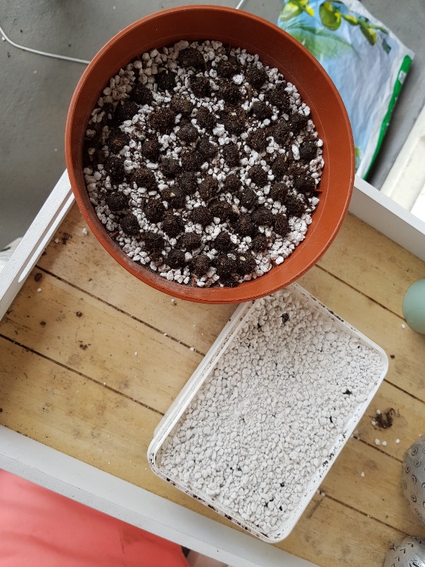 Nieuwsgierigheid heeft toch weer de overhand genomen. Bakje Trachy zaden omgegooid en kwam een mooie verassing tegen. 70 tot 80 % gekiemd binnen 1 maand! Opnieuw opgepot in 1/3 aarde met 2/3 perliet mix en nog toplaagje perliet. Zaadjes op de mix gelegd met de wortels naar beneden in de mix (is dit goed?). Dit gedaan, omdat ik bij mn eerste bakje wortelrot heb geconstateerd. De aarde was bij het zaaien heel luchtig, maar is vrij compact geworden. Wil er dus alles aan doen om rot en compacte aarde te voorkomen bij deze grote lading. Hoe kan ik dit hier het beste doen? 1x in de week goed sproeien? Wil geen rot, maar natuurlijk ook geen uitdroging...