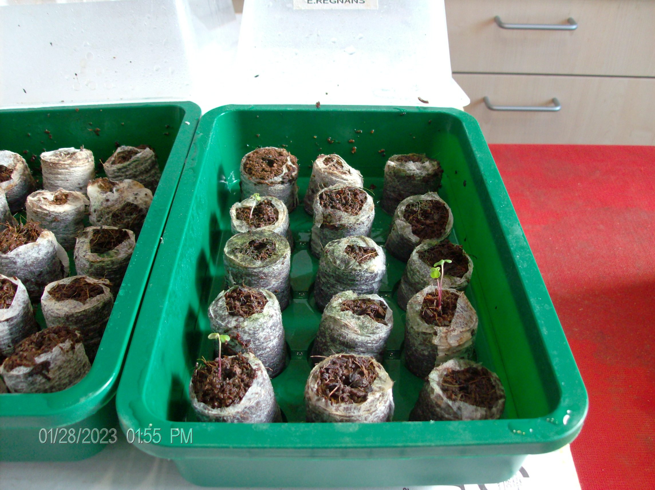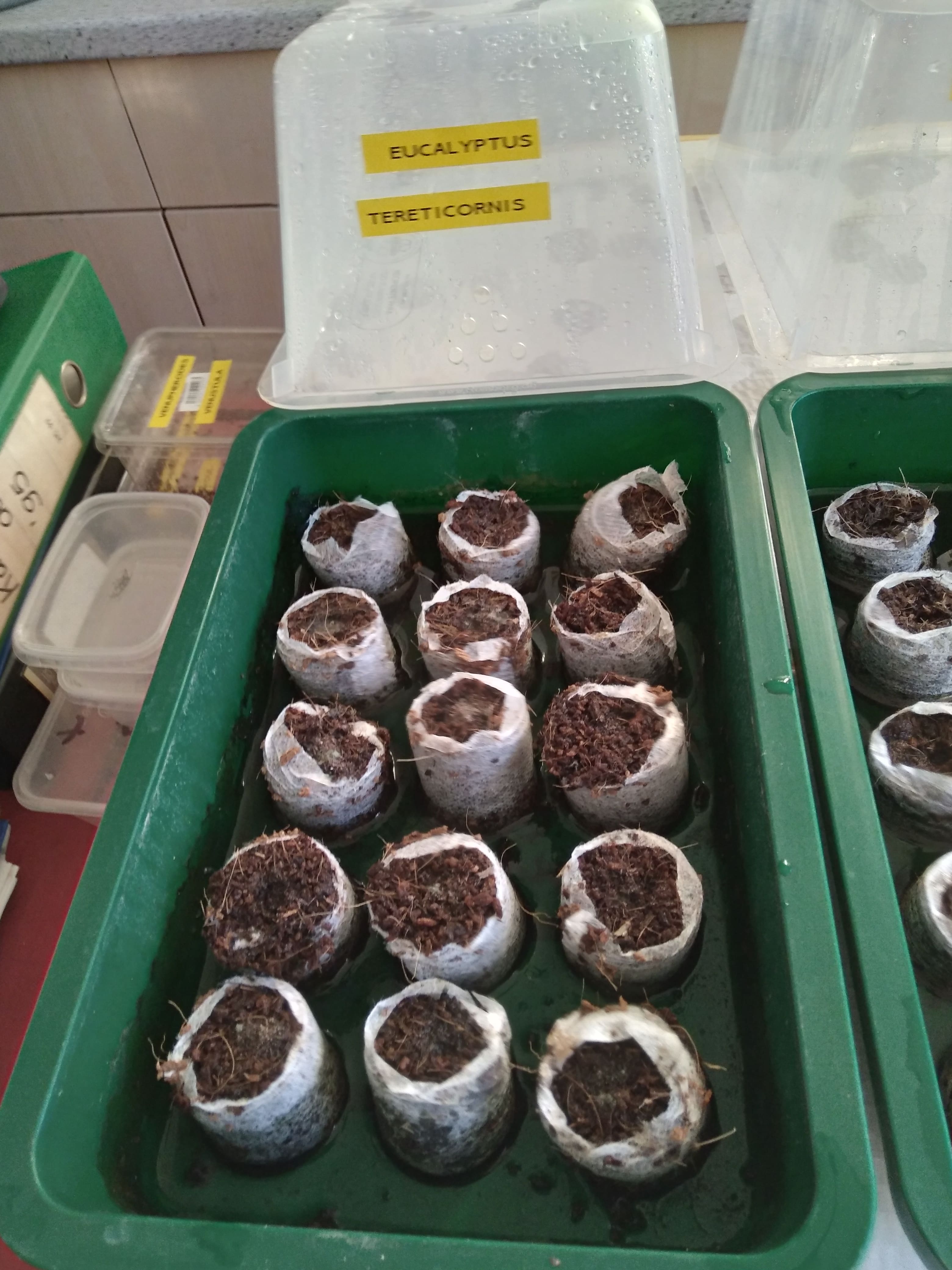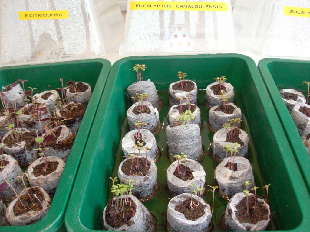 Zowel Eucalyptus grandis I als Eucalyptus grandis II in kweekkasjes binnenshuis.