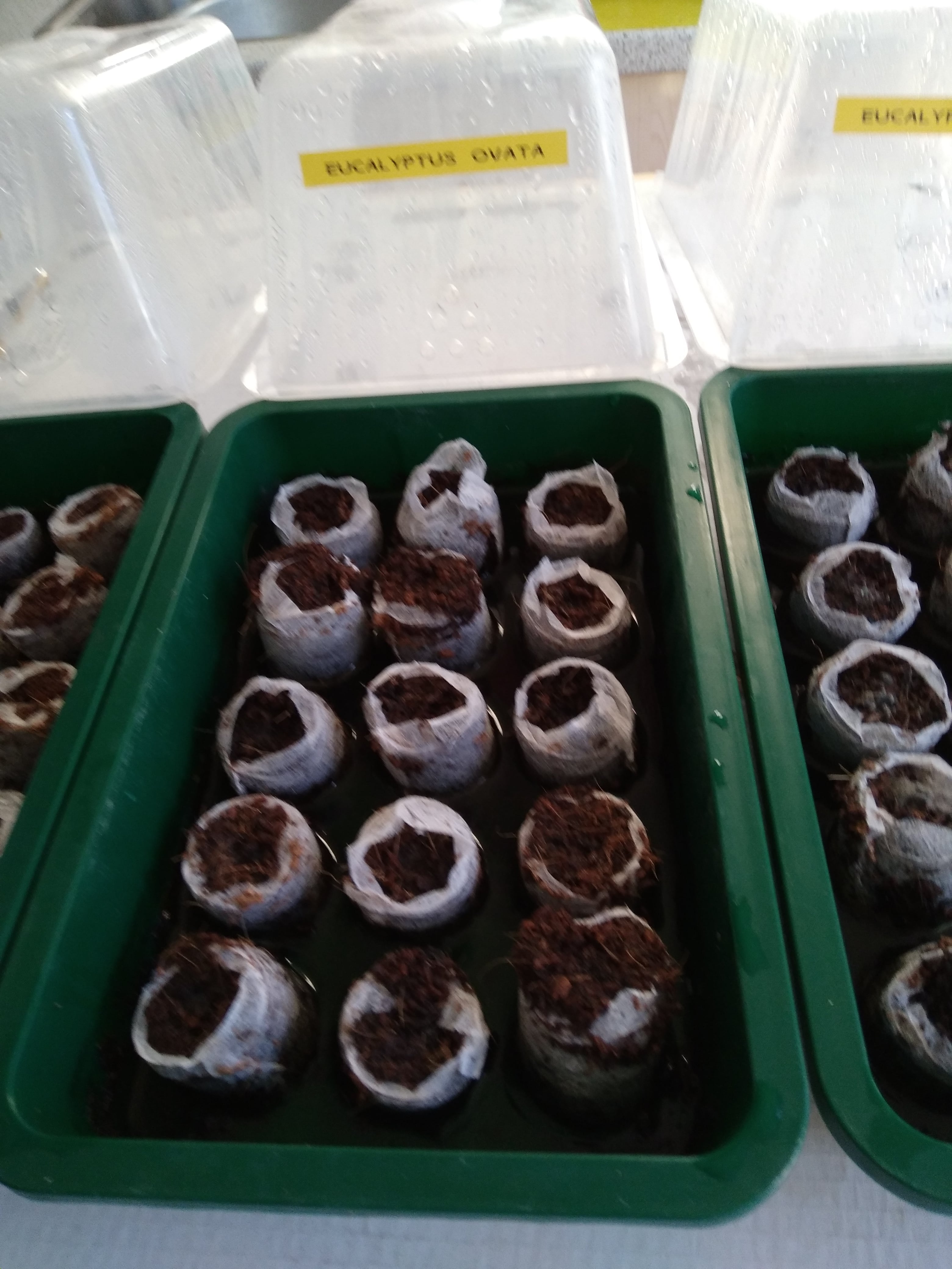 Van Alessio Giovannini (Italië) kochten wij 14 verschillende soorten Eucalyptus zaad: E. botryoides, E. bridgesiana, E. camaldulensis, E. cinerea, E. globulus ssp. bicostata, E. globulus ssp. globulus, E. gomphocephala, E. grandis, E. hybride, E. melliodora, E. occidentalis, E. teteticornis, E. viminalis,