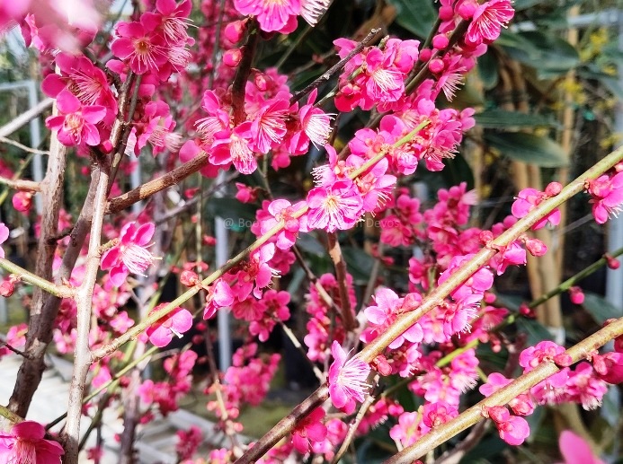 De Prunus mume bloeit heel vroeg in het voorjaar. Bij mij staat hij al vol in bloei. Bestuiving is het effectiefst als je er twee hebt met verschillende genetica. De bloei is decoratief met mooie rode bloemen. Vruchten n ooit gezien.