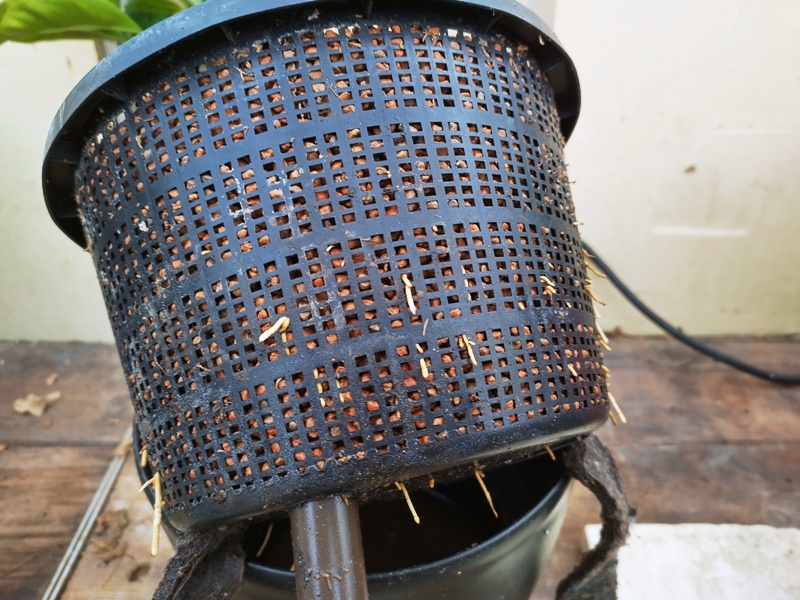 Je ziet dat hij in kleikorrels staat en die weer in een vijvermandje. Dat doe ik meer omdat verrotting van de wortels door te veel water bijna onmogelijk is, maar ik begin er toch wat van terug te komen. Op den duur gaat de groei toch achteruit.
