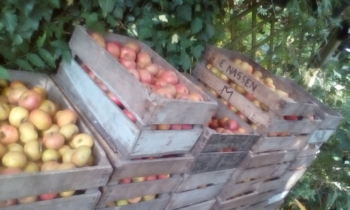 Afgelopen week wat geoogst in verband met nakende nachtvorst. Dit jaar zijn de opbrengsten heel wat minder allicht door het koudere voorjaar maar vooral door de overstromingen in juni. De appels daarentegen zijn er overvloedig. De droge zomer heeft dan weer tot gevolg dat de vruchten ook minder sappig zijn.