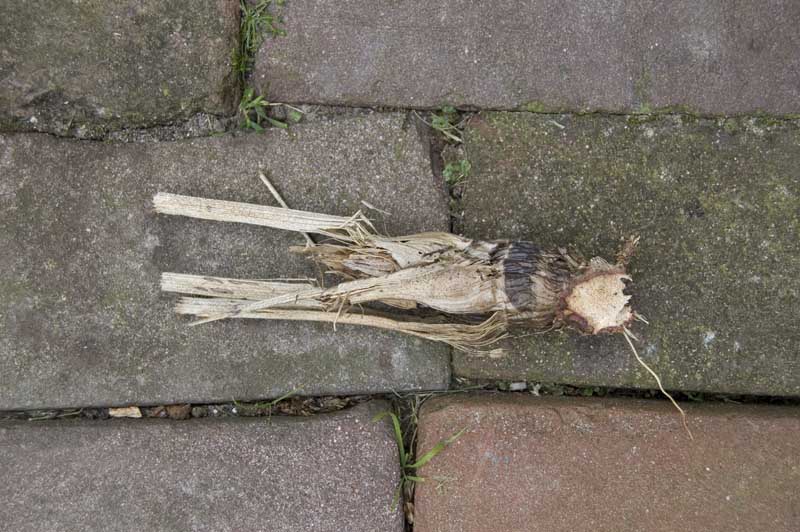 De bladeren zijn een beetje grasachtig, maar wel stugger en zo'n halve meter lang, en tuseen de bladeren zaten ook wat afgestorven bloemstelen.