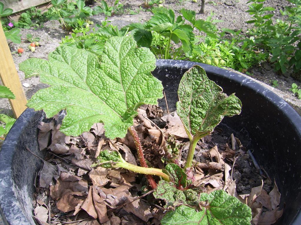 Nieuwe Gunnera vooraan en in speciekuip de oude