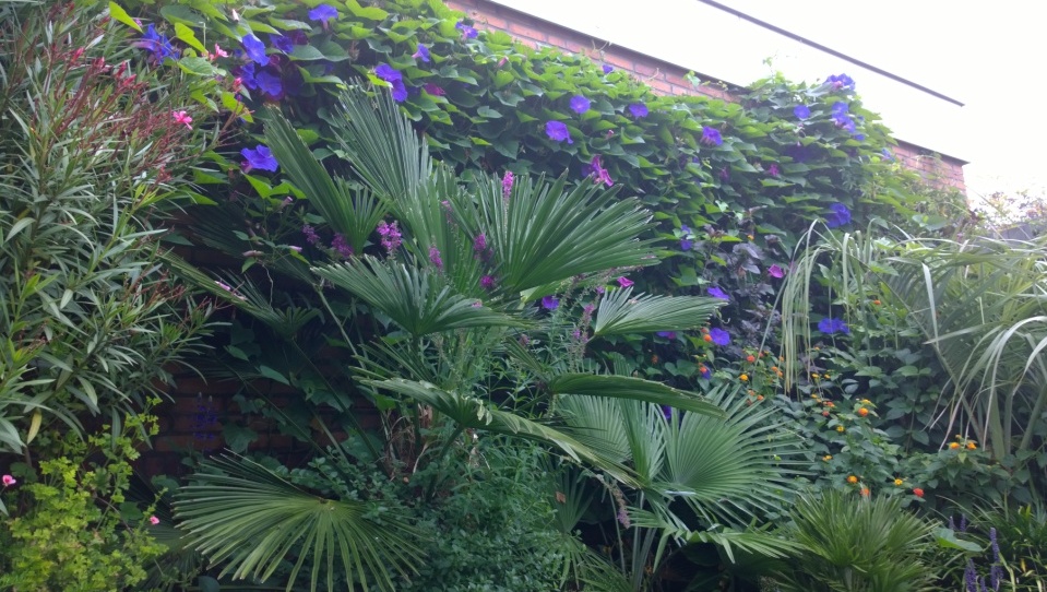 Hier een geweldig seizoen voor de ipomoea. Waar twee kleine stekjes tot uit kunnen groeien in een seizoen zie je op de foto!