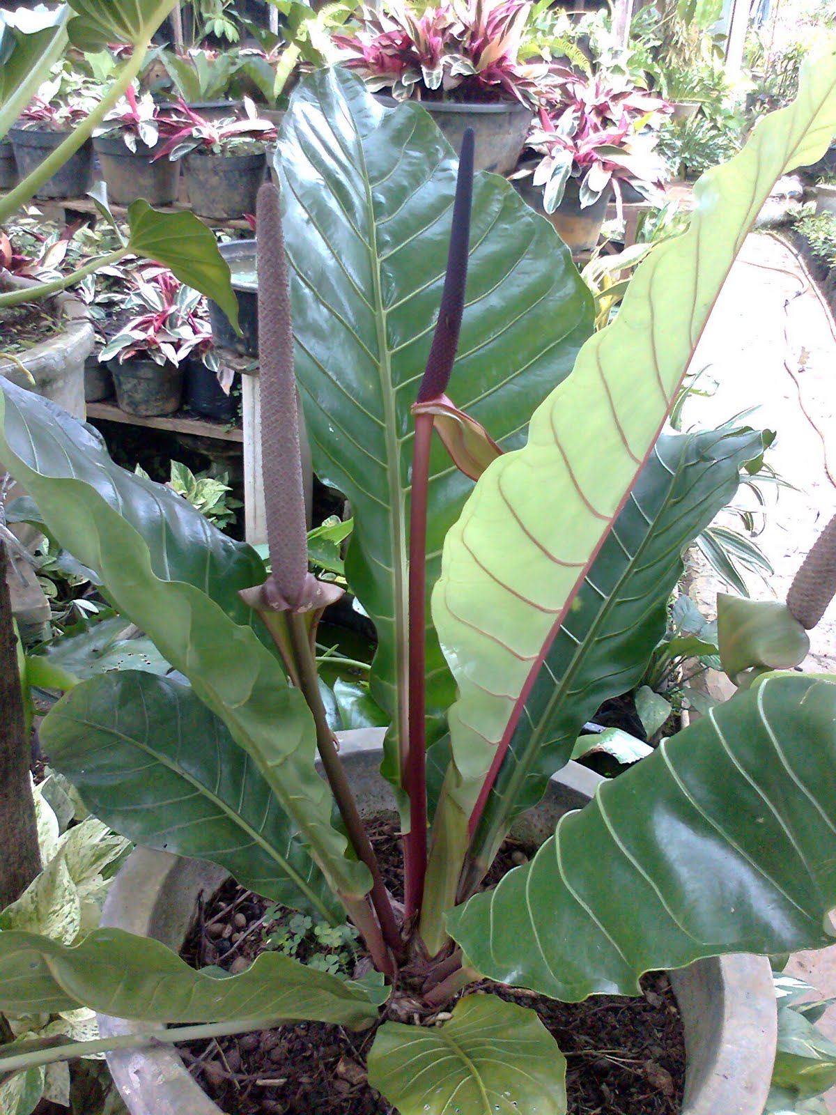 De bladeren zijn wel ongeveer 70cm lang en 30cm breed. Hij geeft ook sinds 2 maanden lange bruine/zwarte stengels waar vaak wat waterdruppels "uitzweten".