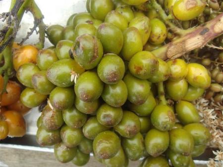 Spijtig geen betere foto van de palm, maar als ik mag gokken op een combinatie van bovenstaande tros zaden en de palm denk ik eerder aan een oliepalm (Elaeis guineensis)???