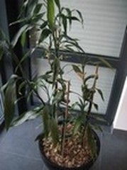 Dit is geen bamboe,maar een Dracaena sanderiana.Deze wordt echter met de "getordeerde" stammetjes verkocht als "Lucky Bamboo".....