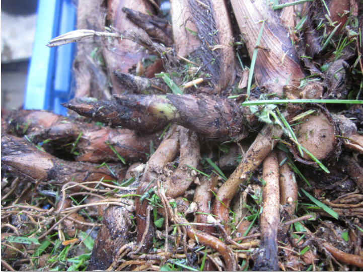 Toen ik vandaag voor de 2e keer op die dag op de groenstort kwam dacht ik hey daar ligt nu een palm. Even beter kijken en het was inderdaad een palm. Hij had op hydrocultuur gestaan en er lag een berg gras op. Even de palm eronder weggehaald en even bekeken. Het viel me op dat bijna elke afzonderlijke stengel een nieuwe of groene speer had. De een iets groter dan de andere. Ik heb die dus maar meegenomen naar huis. Wil hem nog een nieuwe kans geven.