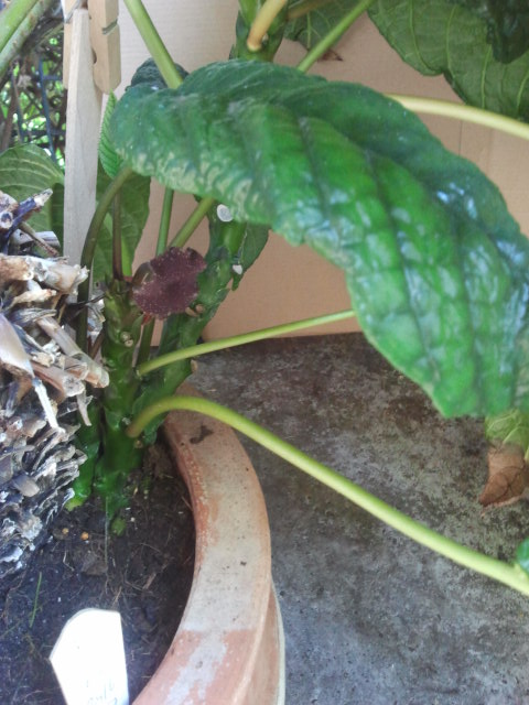 Zoals je kan zien bestaat de plant uit een dikke vlezige hoofdstengel. De bloemetjes zijn donkerpaars en de grote bladeren voelen "kunstmatig" aan.