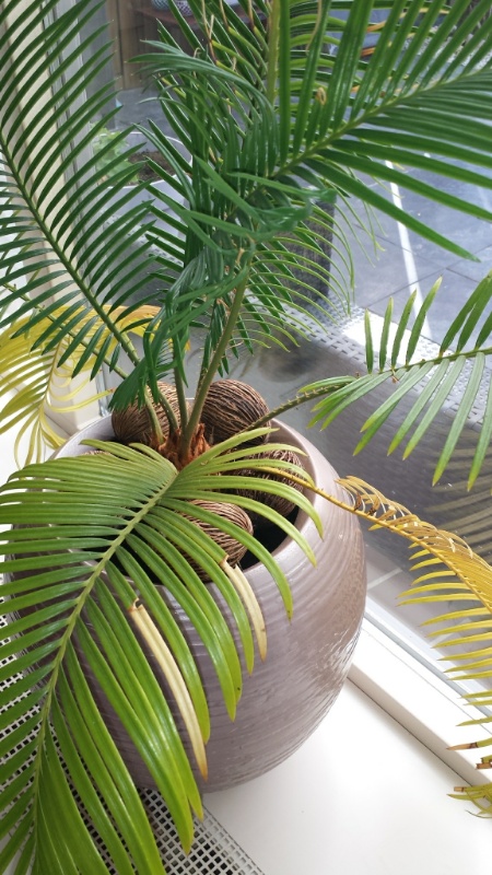 Ik heb de Vredespalm (zo wordt Cycas Revoluta ook genoemd toch?) al 7 jaar in een pot staan op de vensterbank. Ik geef hem weinig water en sowieso niet op de kroon (houdt ie niet van heb ik ooit gehoord).