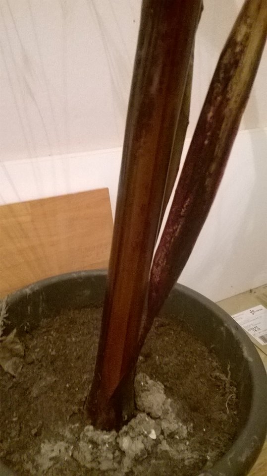 Hoi Remco, bedankt voor je reactie. Hierbij wat extra foto's. Op palmvrienden-facebook werd aan Musa balbisiana 'Thai Black' gedacht. Ik vind ze er allemaal wel wat op lijken. En dan ziet hij er binnen weer anders uit dan buiten. En momenteel ziet hij er vrij beroerd uit, het wordt tijd dat hij weer naar buiten kan.