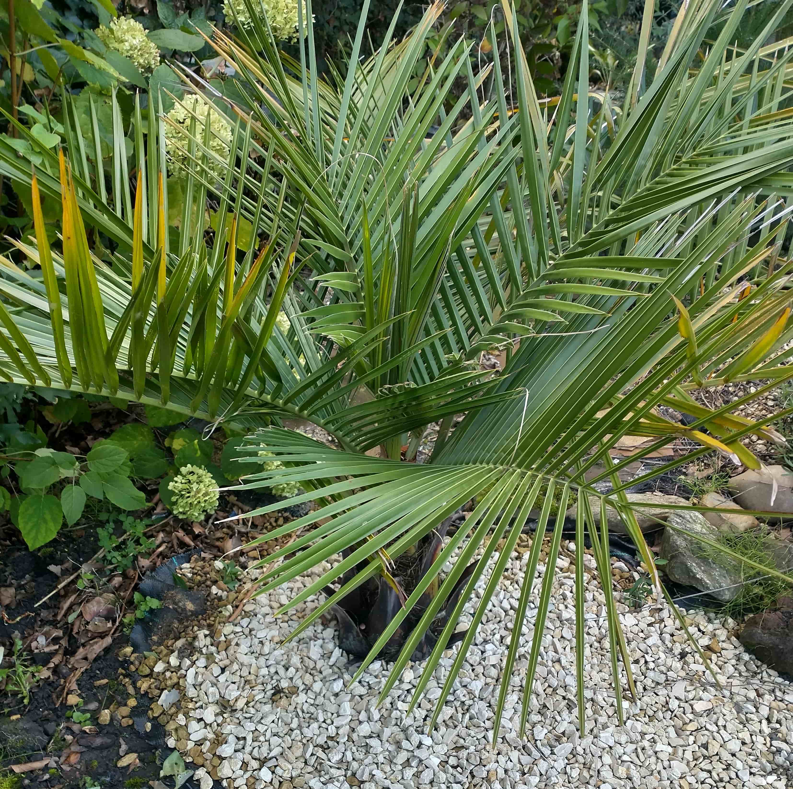 Ik vind het moeilijk te beoordelen, ik heb deze geloof ik zo'n 2 en een half jaar waarvan het eerste half jaar in pot overwinterd in de koude kas en vorig jaar in de volle grond met op z'n koudst -12.. dit jaar was niet bepaald een goed jaar qua zon uren en temperatuur, maar zoals je kan zien op de foto is er wel groei te zien, zie het kleurverschil van de stam bovenin. Ik denk dat de palm goed is aangeslagen en in een warm zonnig jaar nog wel eens heel hard kan groeien.