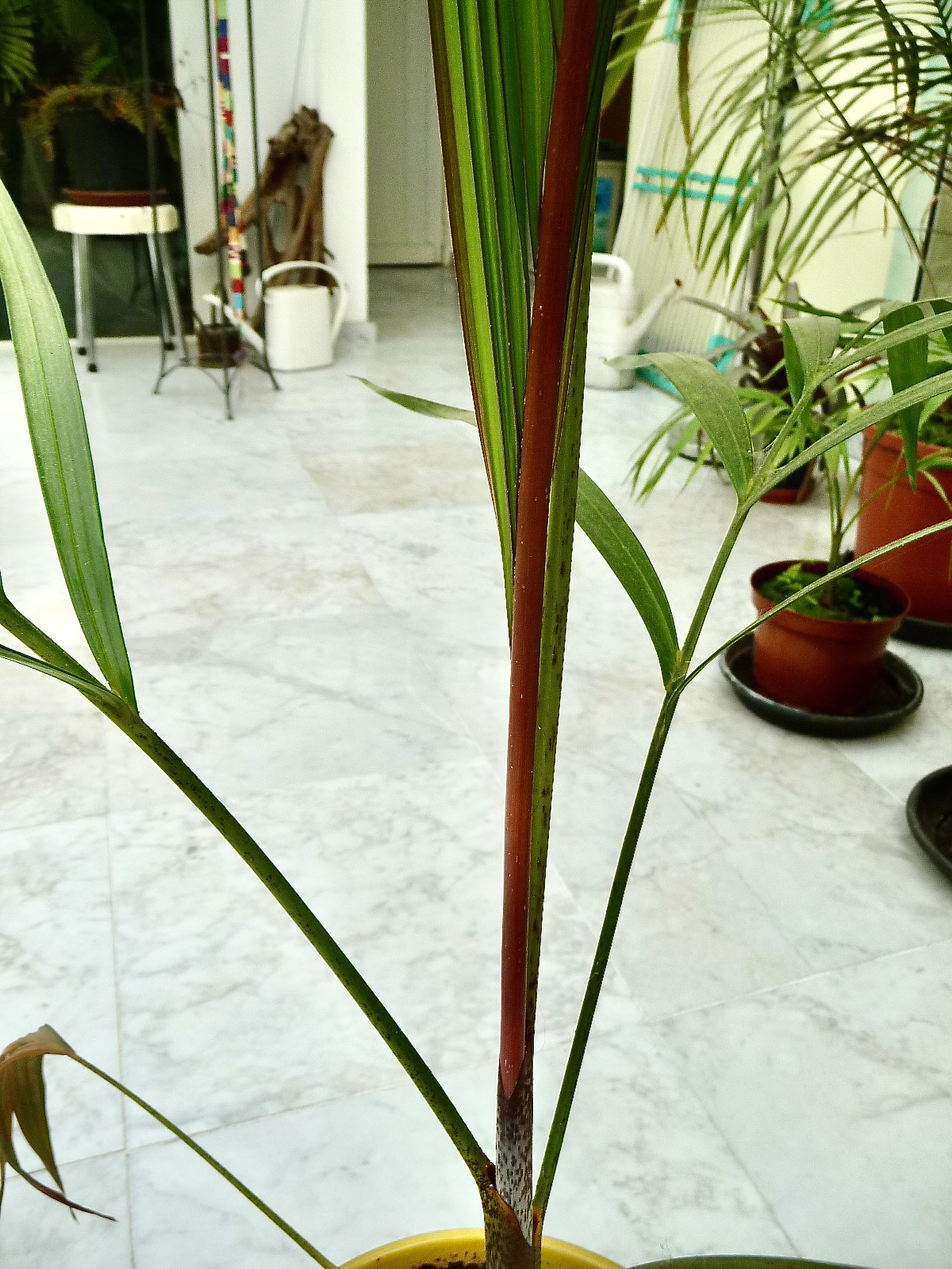 Nu komt bij de grootste palm het nieuwe blad omhoog en zie ik dat de steel rood kleurt en weet ik het niet meer! komt die iemand bekend voor dan graag een bevestiging van wat het dan wel is